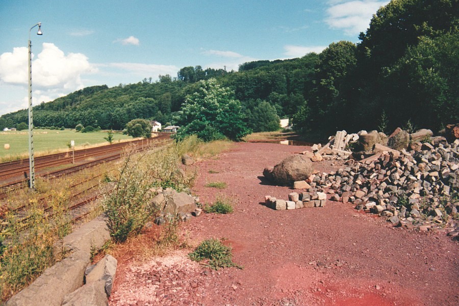 – Die Fläche oberhalb der hohen Seitenrampe, an der sich das Sturzgerüst für die Erzverladung befand (an der Kante links im Bild). Hier lagen die Schmalspurgleise der Ernstbahn.