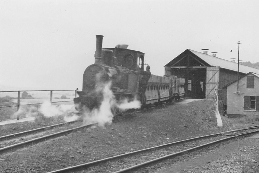 – Das Bild zeigt den Bereich der Schmalspurgleise. Die Lokomotive „Braunfels“ der Ernstbahn schiebt gerade einen Erzwagenzug auf das mit einer hölzernen Einhausung versehene Sturzgerüst.