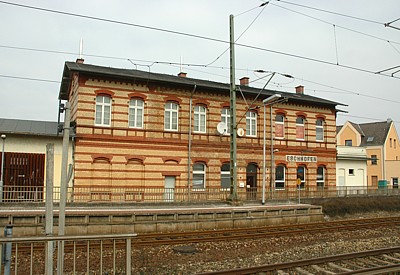 Bahnsteigtunnel, Fahrleitung und Lichtsignalen. Das denkmalgeschützte Bahnhofsgebäude entstand wahrscheinlich 1896 (nach anderer Angabe schon 1862), umfasste aber ursprünglich nur vier Fensterachsen. Erst nach dem Zweiten Weltkrieg wurde es auf die heutige Breite erweitert. |