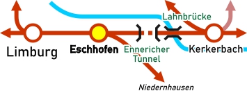 – Eschhofen hat die Anlage eines großzügigen Trennungsbahnhofes: Die Lahntalbahn Wetzlar – Weilburg –