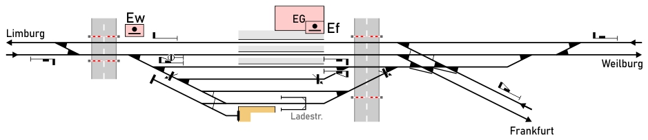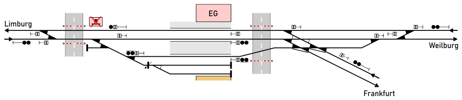 Limburg bildet die durchgehenden Hauptgleise, die Hauptbahn von Niedernhausen (Frankfurt) her mündet zweigleisig ein. Das