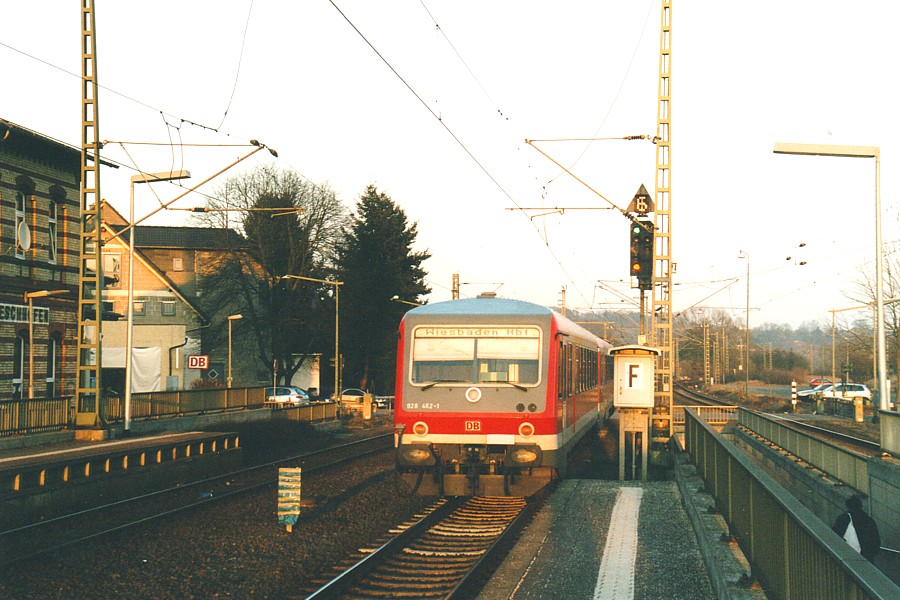 – Ein aus VT 628 und VS 928 gebildeter Triebwagenzug verlässt Eschhofen um 17.24 Uhr, um als RB 95761 über Niedernhausen nach Wiesbaden Hbf zu fahren.