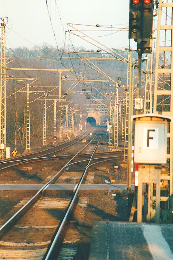 – Blick über die östliche Ausfahrt in Richtung Kerkerbach; die Lahntalbahn ist hier bis zum Einfahrsignal elektrifiziert. Das Südwestportal des Ennericher Tunnels ist gut zu erkennen.