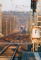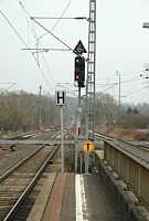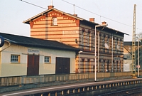Das Bild am Ostkopf des Bahnhofs Eschhofen wird durch das wuchtige, quergestreifte Empfangsgebäude und die zweigleisige