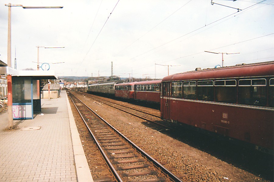 – Im Bahnhof Friedrichsdorf wartet der Personenzug 6766 nach Usingen, gebildet aus einer BR 212, zwei Silberlingen und einer angehängten Schienenbus-Garnitur. Davor eine VT-98-Garnitur im Abstellgleis.