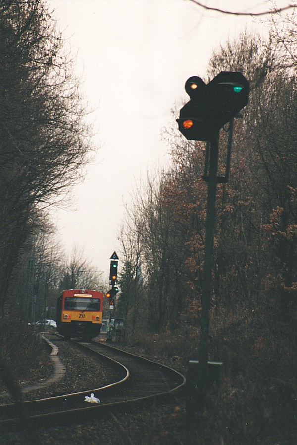 Gleich dreimal Langsamfahrt, am selben Standort wie Bild II.4: Ein VT2E der Taunusbahn von