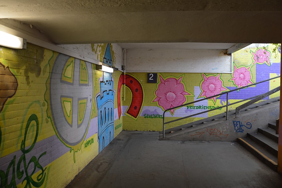 – Die Decke in Form der „Preußischen Kappe“ lässt erahnen, dass dieser Bahnsteigtunnel schon ziemlich alt ist. Er ist mit den Wappenmotiven der Friedrichsdorfer Stadtteile ausgemalt.