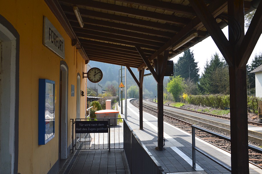 – Der aufgeräumte Hausbahnsteig vor dem historischen Dienstgebäude bietet das ländliche Idyll, wie es für die Lahntalbahn typisch ist. Hier scheint (trotz Normaluhr) die Zeit stehengeblieben zu sein.