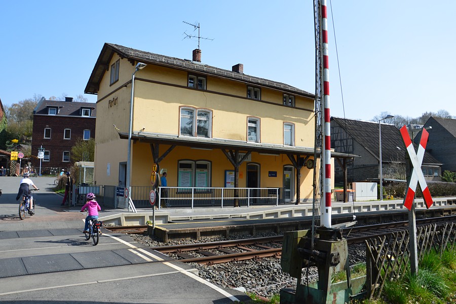 Blick über den hauptsächlich von Fahrradfahrern genutzten Bahnübergang zum Empfangsgebäude. Mit seinen