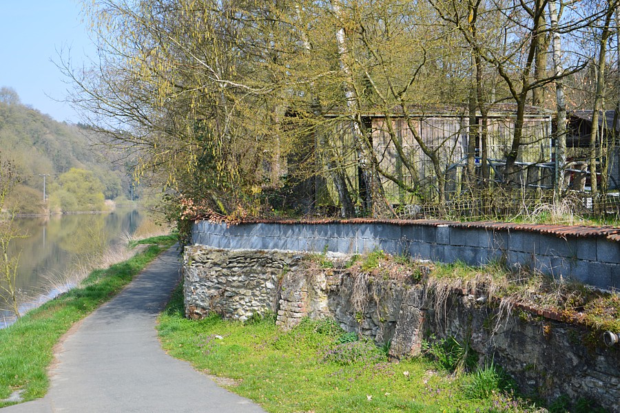 – Direkt jenseits des Bahnübergangs beginnen die Stützmauern, die den Bereich der ehemaligen Chemischen Fabrik markieren. Auf dem Gelände hat heute ein Paddelbootverleiher seinen Lagerplatz.