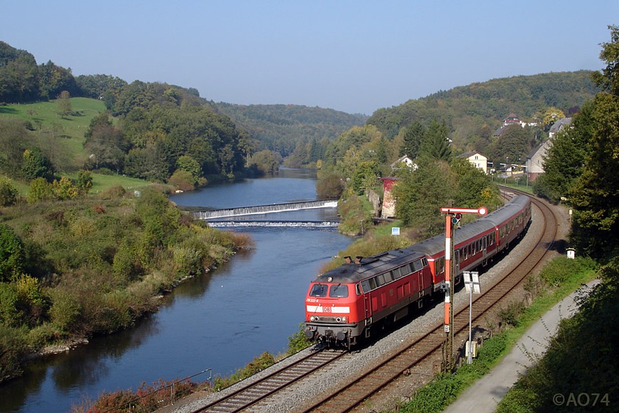 vorn das Blocksignal der Gegenrichtung, in der Bildmitte das zweistufige Fürfurter Wehr, aus den Bäumen rechts davon