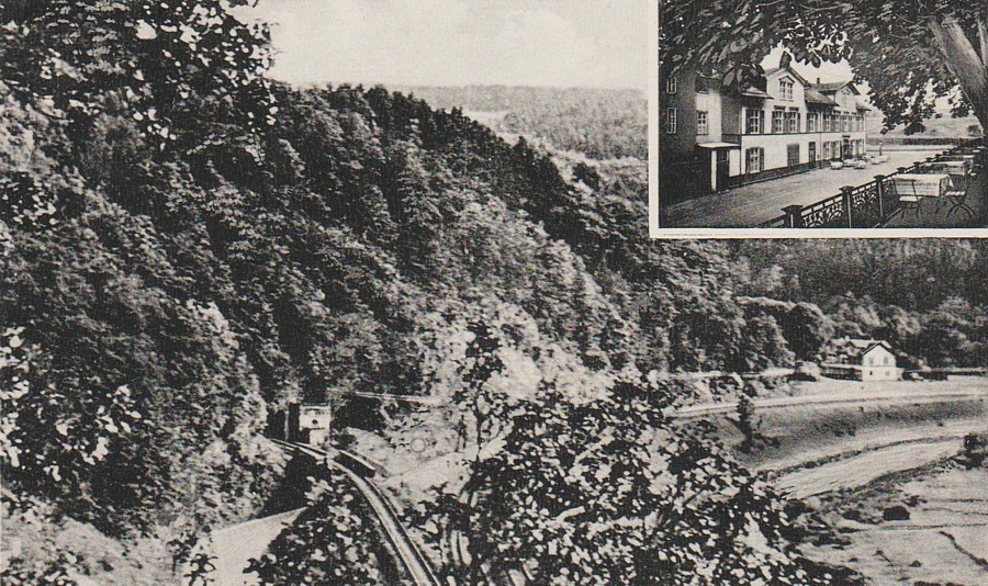 Diese undatierte Ansichtskarte zeigt den Blick in Richtung Süden; im Vordergrund biegt die Weiltalbahn nach links ab, die