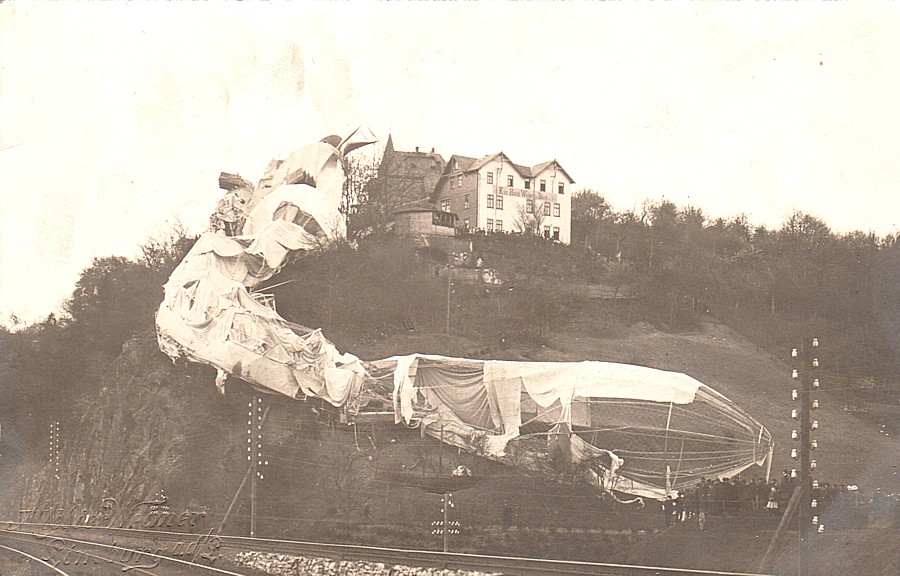Diese Postkarte zeigt das 1910 am Abhang des Webersbergs gestrandete Luftschiff „Z II“. Das Gebäude macht