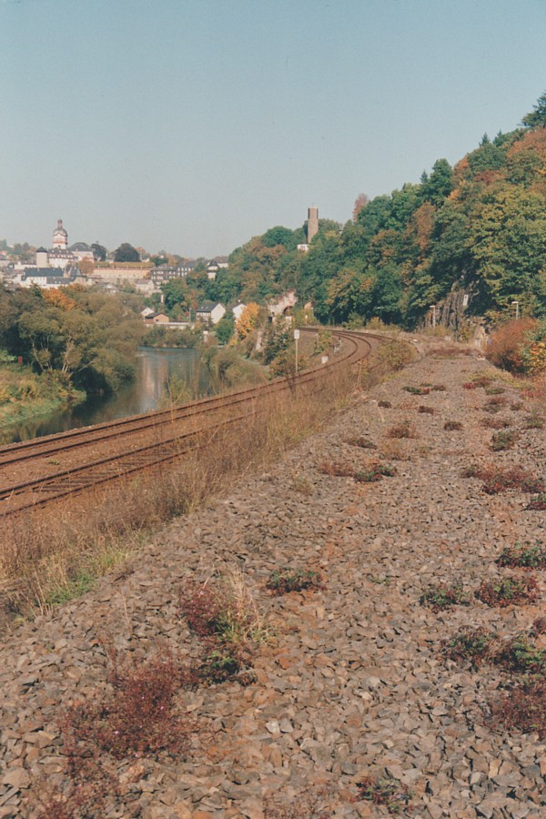 Der Damm der Lahntalbahn und das Schotterbett, in dem früher das Gleis der Weiltalbahn lag. Im Hintergrund das Südportal