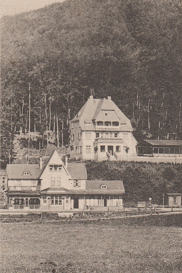 Bildrand ist ein Postenhäuschen o. ä. am Bahnübergang erkennbar. Über dem Bahnhof am Hang thront das Hotel Waldlust.
