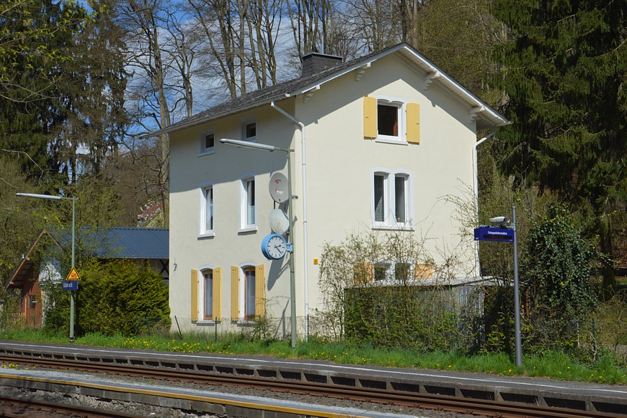 – Am nördlichen Ende des Bahnsteigs steht das ursprüngliche Stationsgebäude von 1862. Es entspricht dem an der Lahnbahn sowohl als Bahnhofs- als auch als Streckenwärterhaus in großer Zahl anzutreffenden Typ.