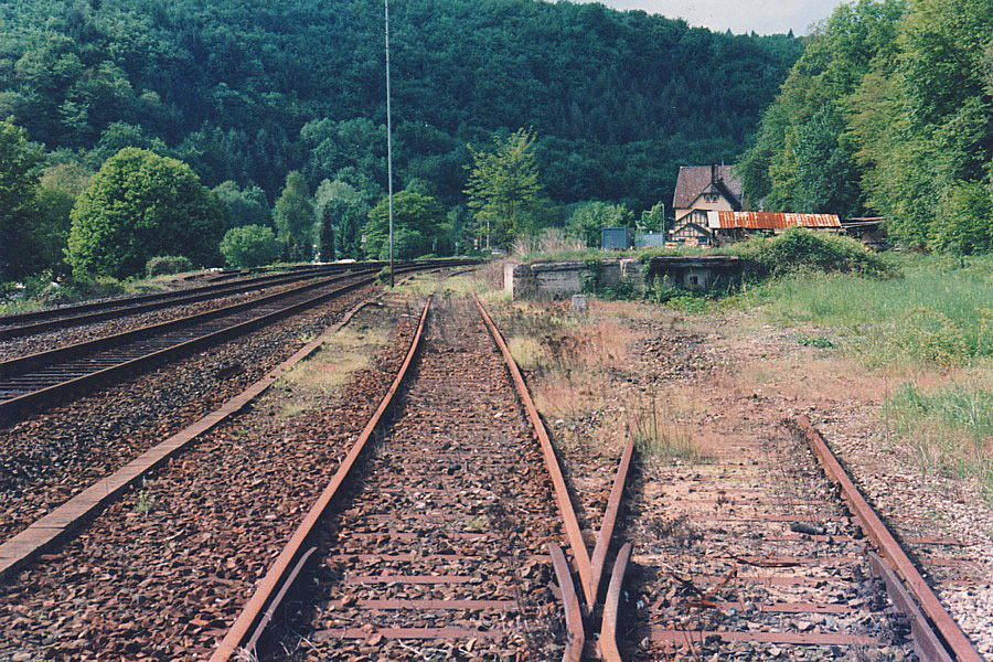 – Blick über die ehemaligen Ladegleise und die Kopframpe (rechts). Rechts vor dem Empfangsgebäude ist das Wellblechdach eines Holzlagers erkennbar – früher wäre so etwas ein typischer Bahnkunde gewesen...