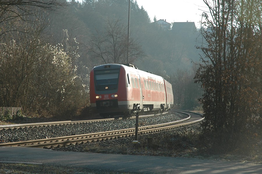 – Auch um die Mittagszeit liegt noch winterlicher Dunst über dem Lahntal, als sich 612 638 als Regionalexpress RE 3287 von Limburg (Lahn) nach Gießen in der Einfahrt von Gräveneck in die Kurve legt.