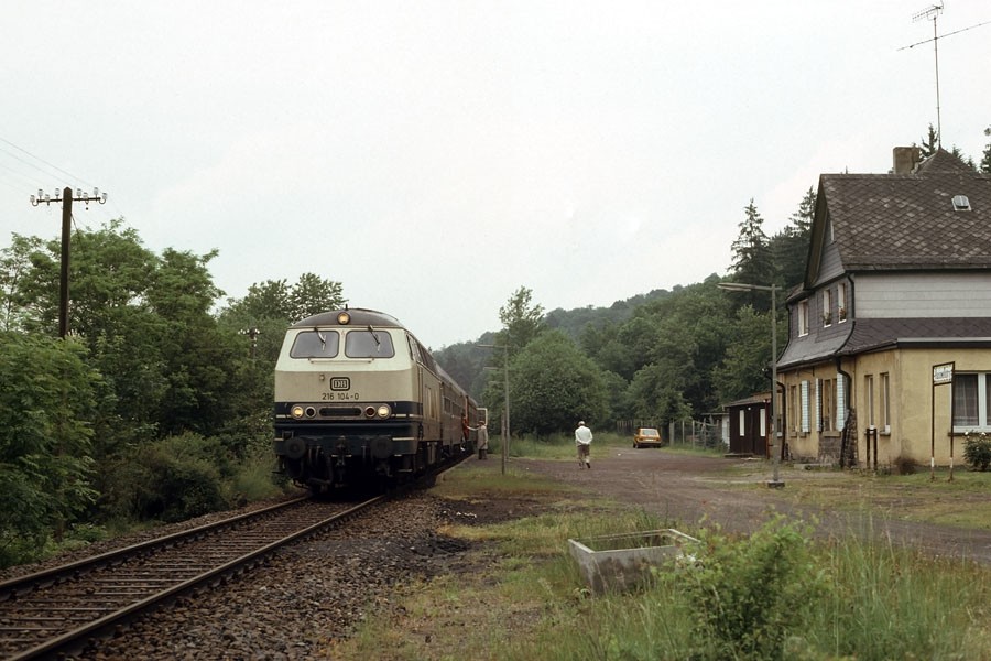 – Der von 216 104 gezogene N 87161 von Wetzlar nach Grävenwiesbach macht am Nachmittag Halt in Hasselborn. Die Anzahl der zusteigenden Reisenden ist überschaubar.