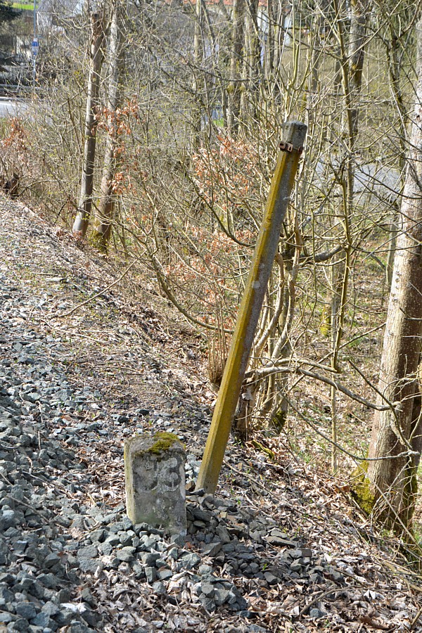 – Neben dem Hektometerstein in km 33,3 lehnt ein alter Betonpfosten; möglicherweise trug er einmal eine Läute- oder Pfeiftafel zur Absicherung des Bahnübergangs.