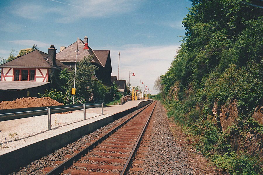 – Blick über den Haltepunkt Hundstadt in Richtung Grävenwiesbach, nach der Neugestaltung. Am Bahnsteig stehen die typischen roten Taunusbahn-Laternen.
