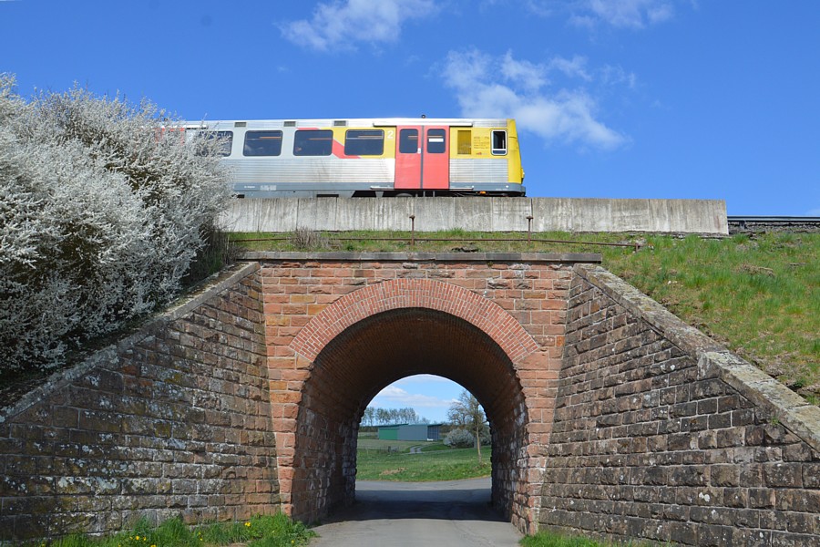 – Unmittelbar nach dem Ende des Bahnsteigs überquert die auf dieser schönen Bogenbrücke die Bahnhofstraße. Oben fährt ein Taunusbahn-VT2E von Grävenwiesbach ein.
