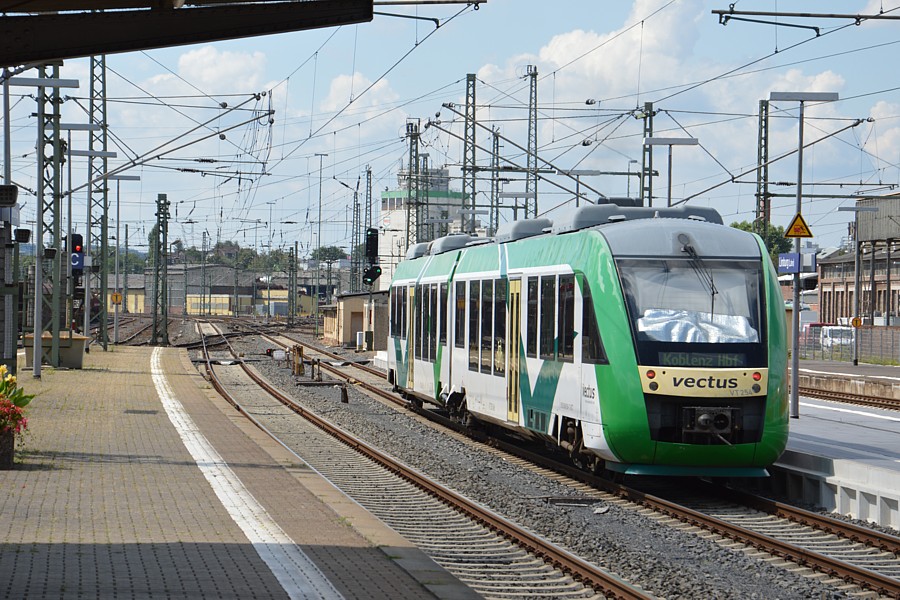 – Ein Vectus-Triebwagen verlässt Limburg auf dem Weg nach Koblenz Hbf.