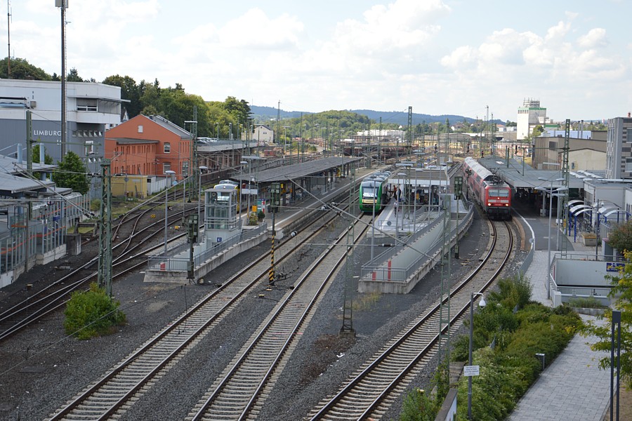 Vom Bahnhofsparkhaus aus geht der Blick über den Personenbahnhof in Richtung Südwesten. Links der graue Turm des