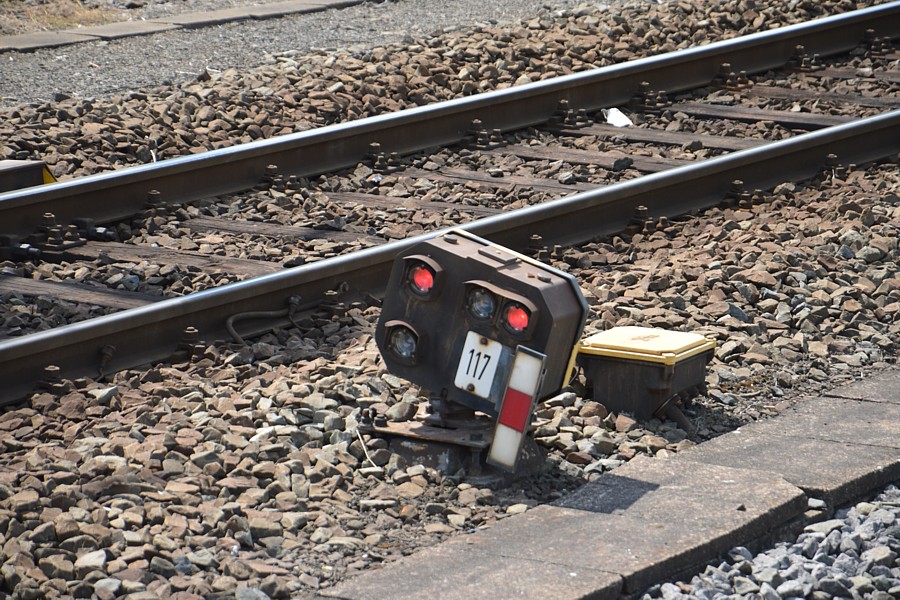 – Ein Schotterzwerg (Hauptsperrsignal in niedriger Bauform) legt neckisch den Kopf schräg – hat er mal eins draufbekommen? An der Bauform kann man erkennen, dass das Spurplanstellwerk von Lorenz stammt.