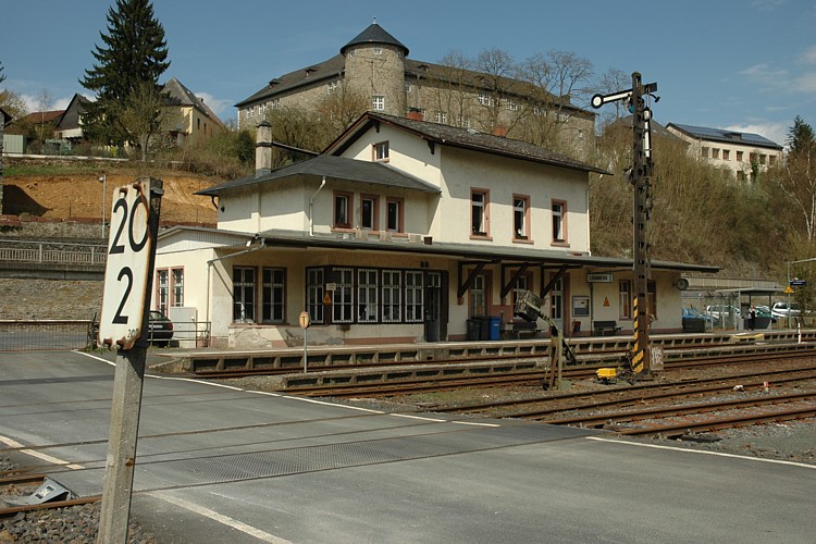 Blick über die Gleise zum Empfangsgebäude des Bahnhofs Löhnberg. Der klassizistische Typenbau von 1863 wurde zu Beginn