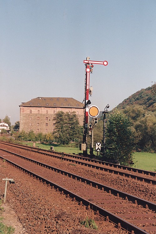 Noch einmal die Signalkombination an der Einfahrt aus Richtung Weilburg. Die Signalscheibe des Geschwindigkeitsanzeigers