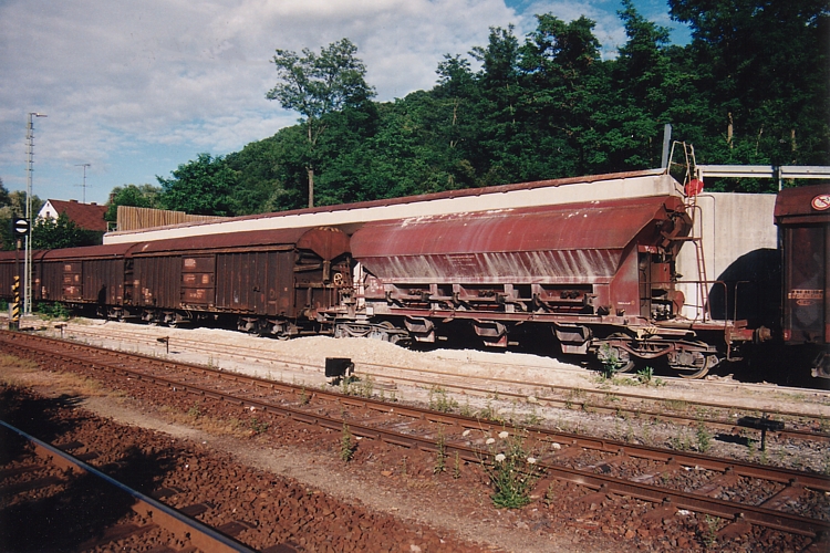– Schwenkdachwagen und ein gedeckter Selbstentladewagen stehen an der Sturzrampe zur Tonverladung bereit.