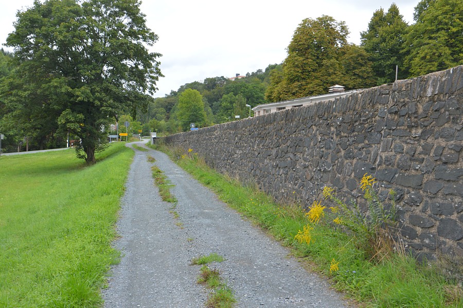 – Der durch eine Stützmauer von der Straße getrennte Schotterweg markiert den Verlauf der Bahntrasse. Rechts hinter der Stützmauer ist die Brauerei zu erahnen.