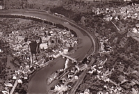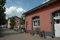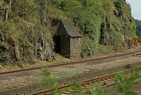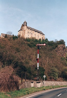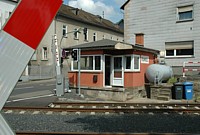 In Runkel teilen sich Straße, Lahn und Eisenbahn ein enges Tal; die historische Lahnbrücke verbindet an der Lahnschleuse die beiden Ufer. Hier liegt in der im 19. Jahrhundert mit dem Ausbau der Verkehrswege entstandenen „Neustadt“ der frühere Bahnhof und heutige Haltepunkt Runkel. In direkter Nachbarschaft befinden sich mehrere Gasthöfe, das Hotel „Zur Lahnbahn“, die frühere Post, das Schleusenwärterhaus und das ehemalige Brückenzollhaus. Dank der Nähe zur Lahnschleuse und dem vorüberführenden Lahntal-Radweg ist der Bahnhof Runkel auch heute noch (zumindest bei schönem Wetter) ein belebter Ort. Das schlichte Stellwerk der heutigen Blockstelle steht direkt am Bahnübergang. |