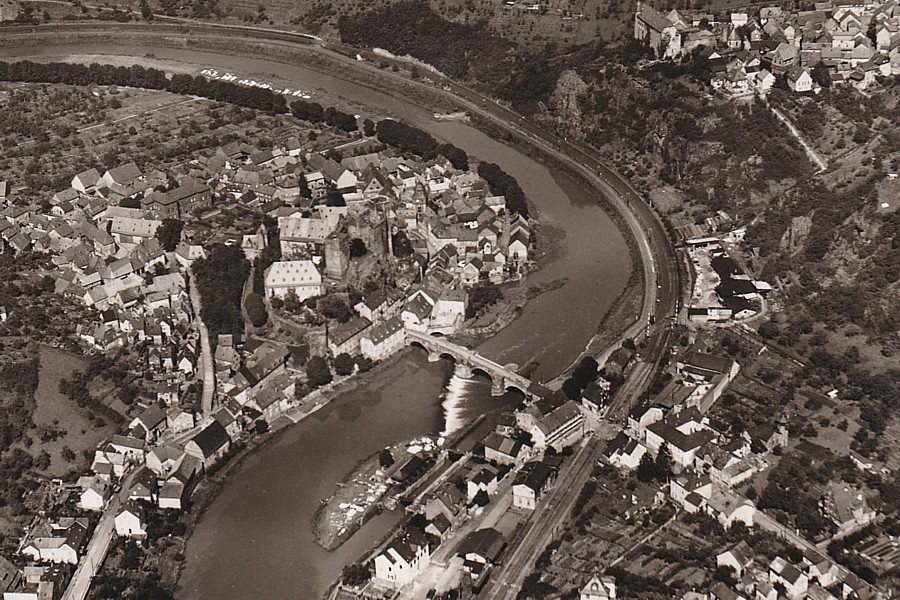 Die undatierte Luftaufnahme zeigt links die Altstadt von Runkel mit der mächtigen Burg; rechts der Lahnbrücke ist die