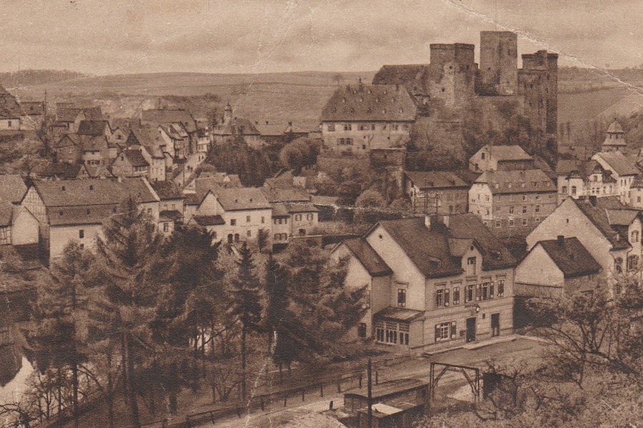 Eine undatierte Postkarte, wahrscheinlich aus den 1930er Jahren; der Blick geht über das Runkeler Postamt zur Burg. Das