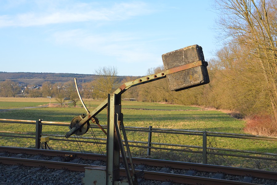 – Das Spannwerk des Blocksignals in Richtung Braunfels leuchtet in der abendlichen Wintersonne. Nur zwei Exemplare dieser stummen Zeugen mechanischer Stellwerkstechnik stehen noch in Solms.