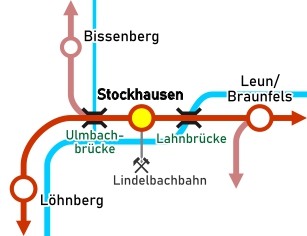 – Stockhausen ist Anschlussbahnhof für die Ulmtalbahn nach Beilstein, die (im Plan grün dargestellte) meterspurige