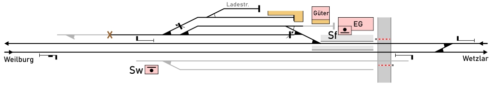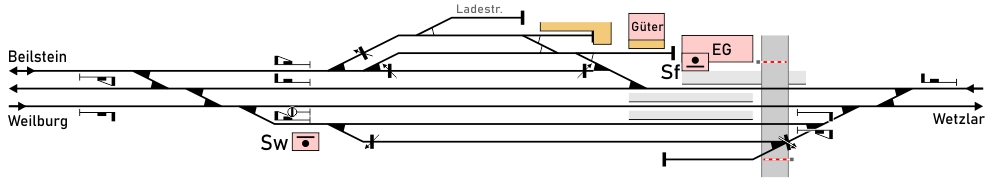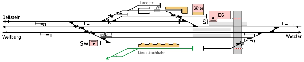 ![]() Die einstige Bedeutung des Bahnhofs Stockhausen (Lahn) als Anschlussbahnhof zur Ulmtalbahn nach Beilstein (Dillkreis) und als Umschlagplatz für die mit der Lindelbachbahn herangebrachten Bergbauerzeugnisse aus dem Braunfelser Raum war noch vor wenigen Jahren am Gleisplan deutlich erkennbar; heute ist die Nebenstrecke längst verschwunden, und die umfangreichen Ladegleise sind abgebaut. |