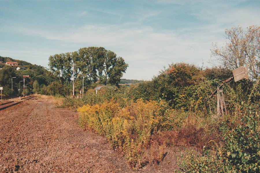 – In Höhe des Empfangsgebäudes sind die Ladegleise bereits entfernt, nur Spuren im Schotter sind zurückgeblieben. Und ein einsames Signalspannwerk verschwindet im wuchernden Grün...