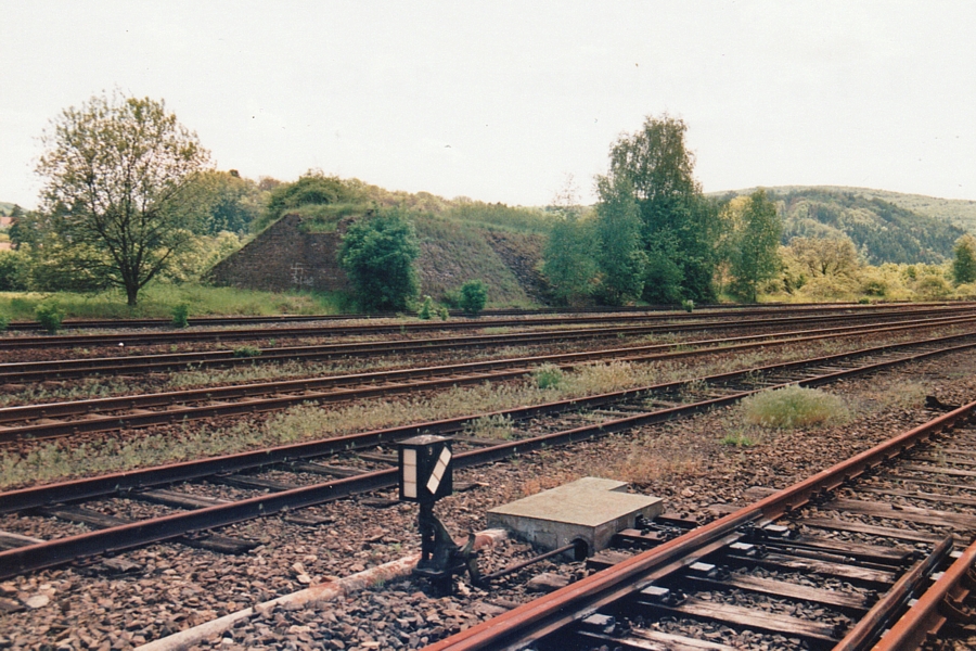 – Blick über das Gleisfeld des Bahnhofs Stockhausen zur Rampe der abgebauten Lindelbachbahn.