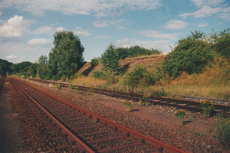 – Die Längsseite des Dammes der Lindelbachbahn. Das massive Bauwerk dominiert bis heute den Bahnhof Stockhausen.