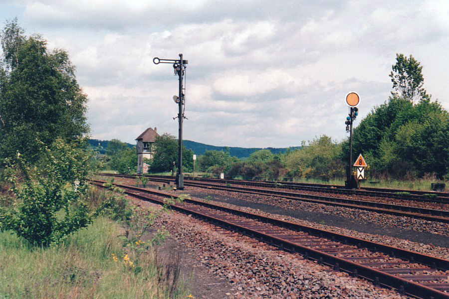 Blick von Südwesten: Wegen der besonderen Länge des Bahnhofs Stockhausen steht das Ausfahrvorsignal (Richtung