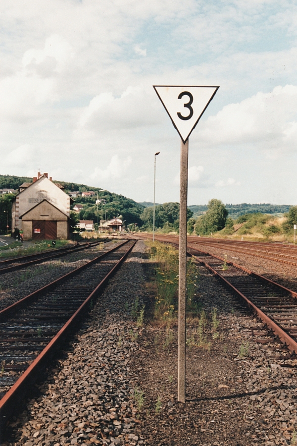 Gleise der bereits ungenutzten Ortsgüteranlage stand 1995 noch diese bestens erhaltene Geschwindigkeitstafel (Signal