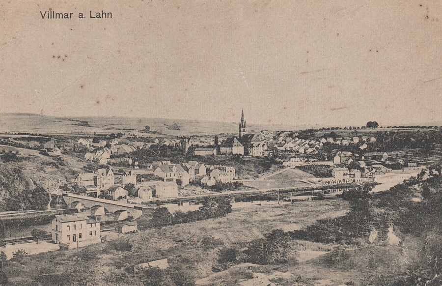 – Diese alte Postkarte zeigt links unten den Bahnhof – das Empfangsgebäude ist praktisch unverändert – und dahinter die marmorne Lahnbrücke und die Ortschaft.