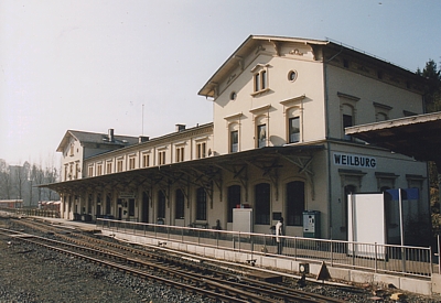 Die Lage im engen Flusstal bestimmt die enorme Längenausdehnung des einst wichtigen Umschlagbahnhofes. Der nördliche Teil des Bahnhofs umfasste die ausgedehnten Erzverladeanlagen; hier befanden sich die Sturzgerüste der Grube Waldhausen und der über den Ottostollen erschlossenen Buderusschen Eisenerzgruben im Norden und Osten der Stadt Weilburg. Weiter südlich schließen bzw. schlossen sich die Güterabfertigung und der Personenbahnhof mit dem Bahnbetriebswerk an. Dabei ist die heute von den Bahnanlagen belegte Fläche (und der inzwischen brachliegende Streifen zum Lahnufer hin) schon das Resultat eines massiven Eingriffs in das Flusstal, der zwischen 1910 und 1920 durchgeführt wurde. Nachdem 1890/92 die Weiltalbahn nach Weilmünster und Laubuseschbach in Betrieb genommen und 1909 bis Grävenwiesbach (und damit über Bad Homburg nach Frankfurt) verlängert worden war, außerdem Weilburg D-Zug-Halt auf der Relation Berlin – Metz – Paris geworden war, stiegen die Umschlagszahlen sprunghaft an. Von 1901 bis 1910 stieg der jährliche Stückgutumschlag von 453 auf 5.559 Stück, der Wagenladungsumschlag von 25.785 t auf 168.226 t. Im Jahr 1910 nutzten 183.416 Fahrgäste den Bahnhof Weilburg. Deshalb wurde nach 1910 das Lahnufer an der Ahäuser Seite durch Felssprengungen erweitert, der Ahäuser Weg verlegt und das gesamte Flussbett nach Osten verschoben. Durch die nachfolgende Aufschüttung am Westufer konnte zusätzliche Fläche für den Bahnhof gewonnen werden. Auch an der Westseite des Tales wurde der Fels weggesprengt und der Löhnberger Weg verlegt. Das Empfangsgebäude ist, ebenso wie das etwas ältere in Diez, ein Entwurf des Architekten D. H. Velde aus Diez. Der imposante „spätklassizistische Putzbau mit kontrastierender Werksteingliederung“ macht die einstige Bedeutung Weilburgs deutlich. Nach langen Jahren des Niedergangs verkaufte die DB im Jahr 2007 das Gebäude; inzwischen wurde das Hotel „Lahnbahnhof“ eröffnet. |