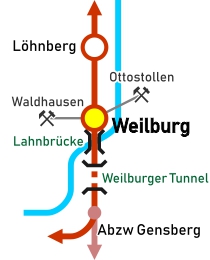 Von Löhnberg aus führt die Lahntalbahn parallel zur Landstraße am rechten (westlichen) Ufer des Flusses entlang. Hinter der Straßenbrücke nach Ahausen wird das Tal zwischen zwei Berghöhen eingezwängt, und an der schmalsten Stelle des Tals liegt der langgestreckte Bahnhof von Weilburg. Unmittelbar am südlichen Bahnhofskopf überquert die Lahntalbahn den Fluss und die Landstraße nach Ahausen, um sodann im Weilburger Tunnel den Weilburger Stadtfelsen zu unterqueren.
