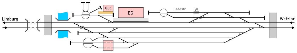 mittleren Lahntal. Der südliche (linke) Bahnhofskopf dient dem Personenverkehr; die Abzweigstelle Gensberg ist betrieblich