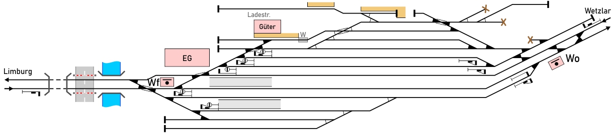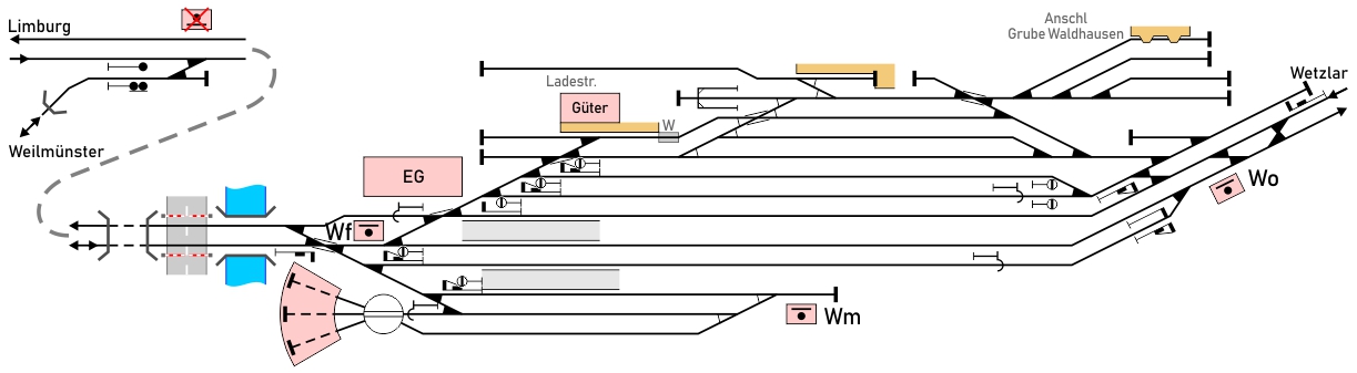 Waggondrehscheibe befinden sich noch am Südkopf, zwischen Empfangsgebäude und Lahnbrücke. Die Stellwerke Wf, Wm und Wo