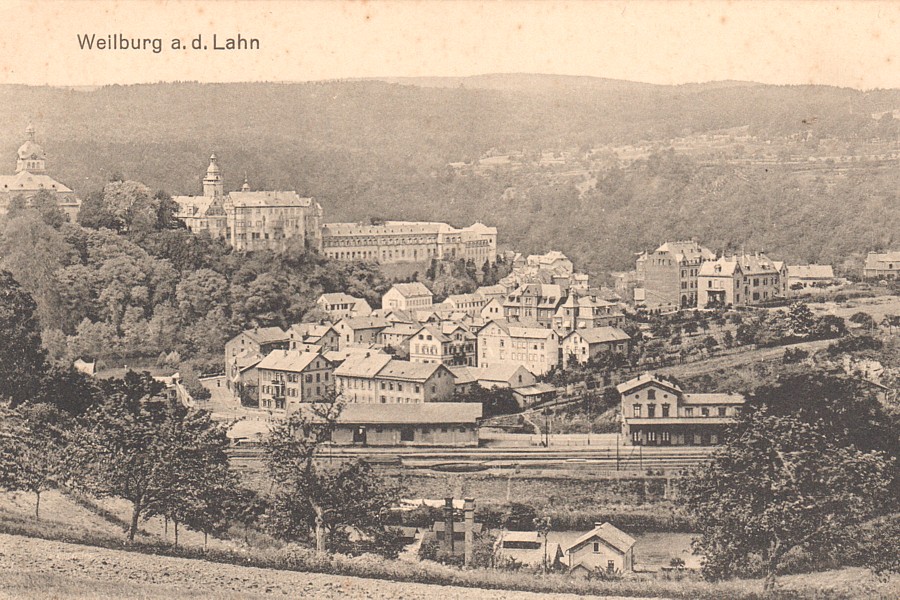 über die Lahn. Vor dem Güterschuppen ist die Drehscheibe erkennbar; das Turmstellwerk ist noch nicht vorhanden, auch